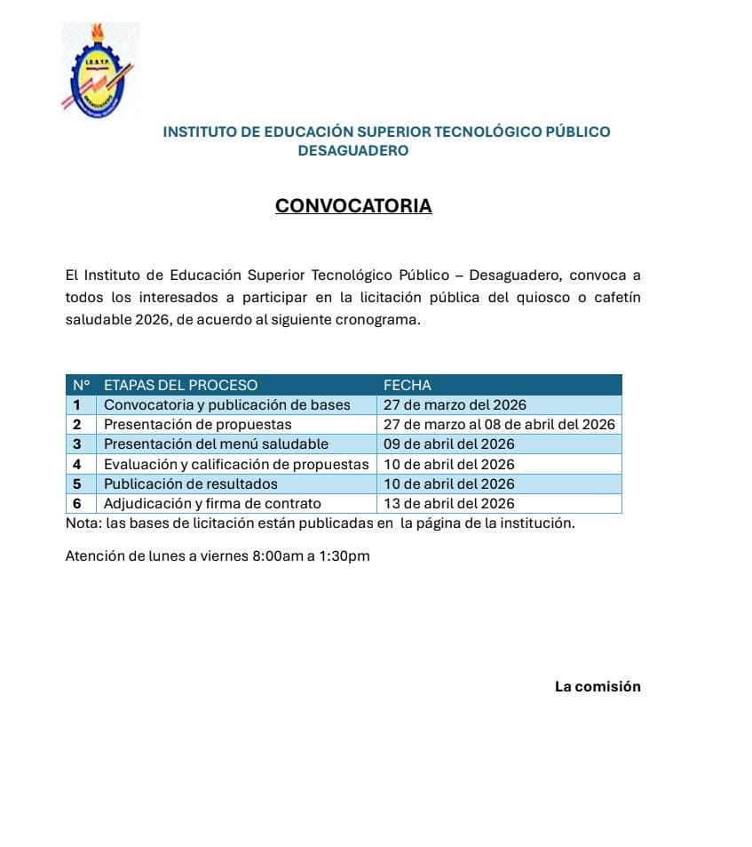 Gracias por su visita a nuestro Portal Web Institucional. En nombre de todo el personal docente, administrativo y de servicios del IESTP Desaguadero, le expresamos nuestro más cordial saludo y agradecimiento.
