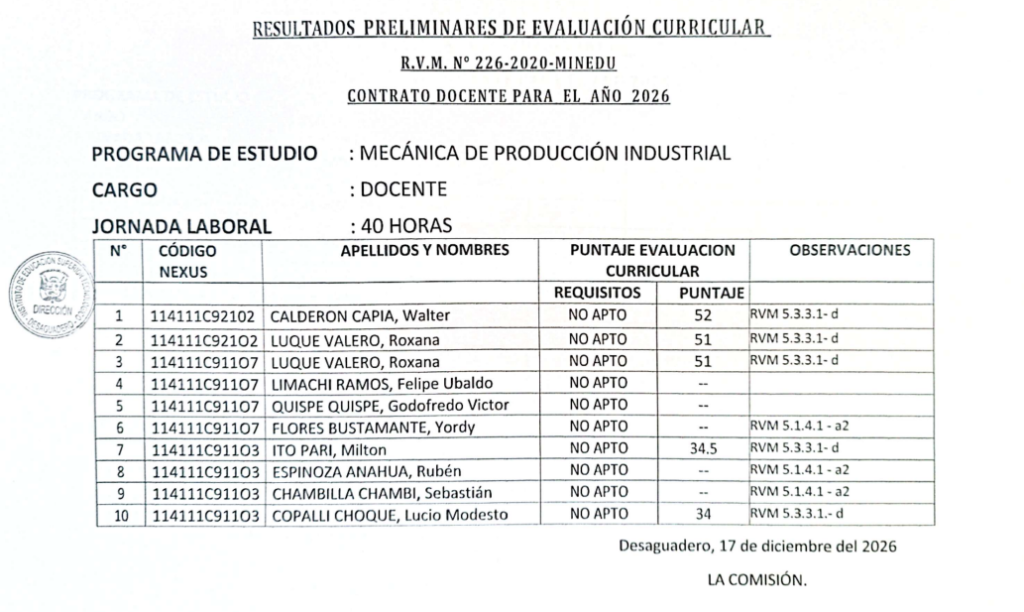 RESULTADOS FINALES - DEL PROCESO DE CONVOCATORIA DOCENTE IESTP DESAGUADERO 2026